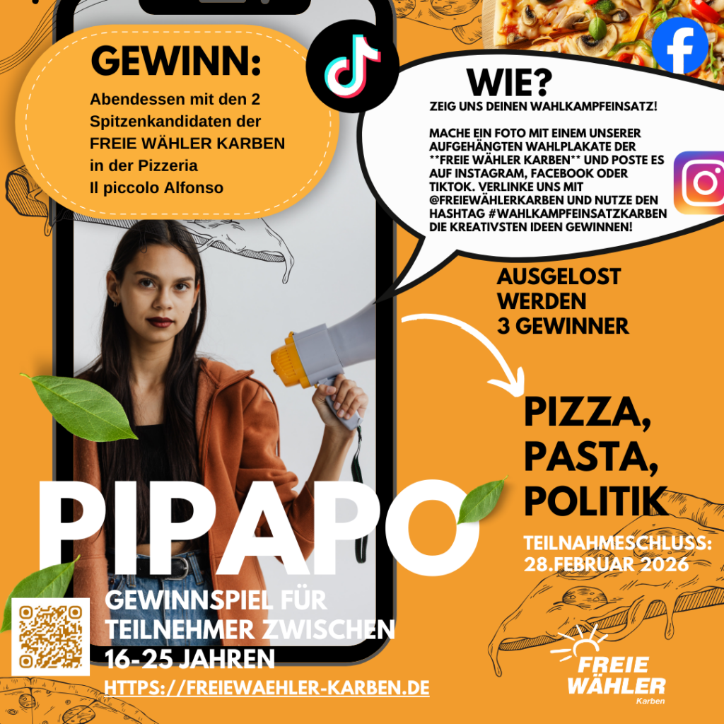 MACHE EIN FOTO MIT EINEM UNSERER AUFGEHÄNGTEN WAHLPLAKATE DER **FREIE WÄHLER KARBEN** UND POSTE ES AUF INSTAGRAM, FACEBOOK ODER TIKTOK. VERLINKE UNS MIT @FREIEWÄHLERKARBEN UND NUTZE DEN HASHTAG #WAHLKAMPFEINSATZKARBEN